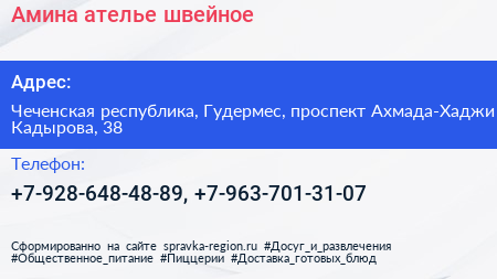 Амина, ателье швейное по адресу Чеченская республика, Гудермес, проспект Ахмада-Хаджи Кадырова, 38 в дальнейшем Организация, размещена в следующих категориях: