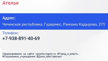 Ателье по адресу Чеченская республика, Гудермес, Рамзана Кадырова, 271 в дальнейшем Организация, размещена в следующих категориях: