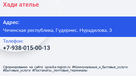 Хади, ателье по адресу Чеченская республика, Гудермес, Нурадилова, 3 в дальнейшем Организация, размещена в следующих категориях: