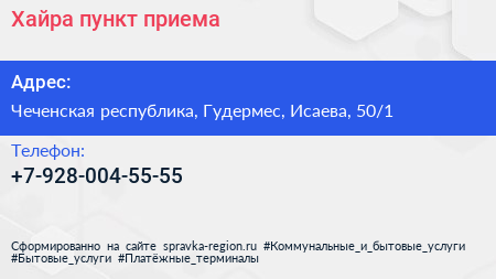 Хайра, пункт приема по адресу Чеченская республика, Гудермес, Исаева, 50/1 в дальнейшем Организация, размещена в следующих категориях: