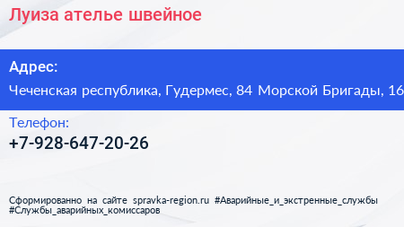 Луиза, ателье швейное по адресу Чеченская республика, Гудермес, 84 Морской Бригады, 16 в дальнейшем Организация, размещена в следующих категориях: