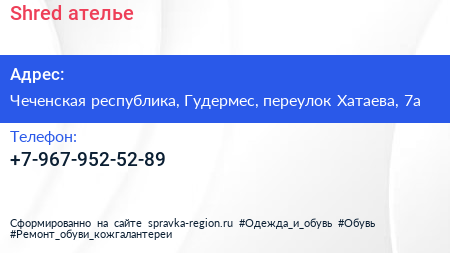 Shred, ателье по адресу Чеченская республика, Гудермес, переулок Хатаева, 7а в дальнейшем Организация, размещена в следующих категориях:
