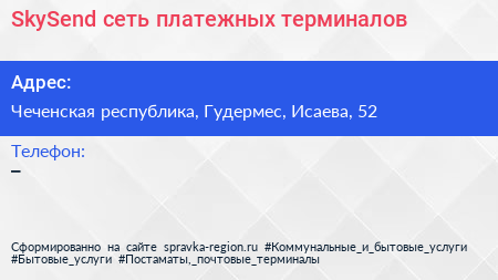 SkySend, сеть платежных терминалов по адресу Чеченская республика, Гудермес, Исаева, 52 в дальнейшем Организация, размещена в следующих категориях: