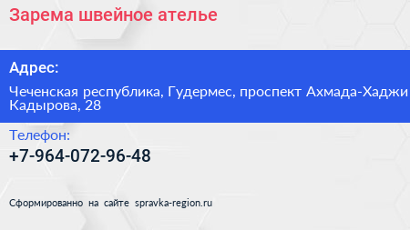 Зарема, швейное ателье по адресу Чеченская республика, Гудермес, проспект Ахмада-Хаджи Кадырова, 28 в дальнейшем Организация, размещена в следующих категориях: