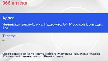 366, аптека по адресу Чеченская республика, Гудермес, 84 Морской Бригады, 16а в дальнейшем Организация, размещена в следующих категориях: