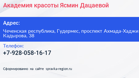 Академия красоты Ясмин Дацаевой по адресу Чеченская республика, Гудермес, проспект Ахмада-Хаджи Кадырова, 38 в дальнейшем Организация, размещена в следующих категориях: