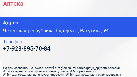 Аптека по адресу Чеченская республика, Гудермес, Ватутина, 94 в дальнейшем Организация, размещена в следующих категориях: