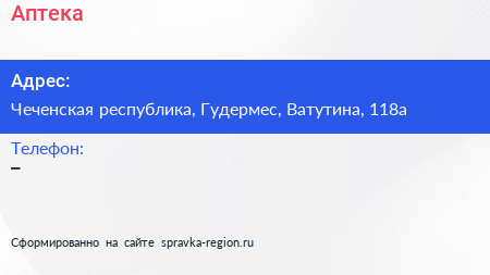 Аптека по адресу Чеченская республика, Гудермес, Ватутина, 118а в дальнейшем Организация, размещена в следующих категориях: