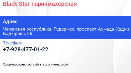 Black Star, парикмахерская по адресу Чеченская республика, Гудермес, проспект Ахмада-Хаджи Кадырова, 28 в дальнейшем Организация, размещена в следующих категориях: