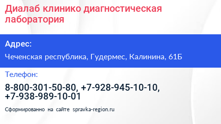 Диалаб, клинико-диагностическая лаборатория по адресу Чеченская республика, Гудермес, Калинина, 61Б в дальнейшем Организация, размещена в следующих категориях: