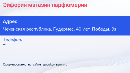 Эйфория, магазин парфюмерии по адресу Чеченская республика, Гудермес, 40 лет Победы, 9а в дальнейшем Организация, размещена в следующих категориях: