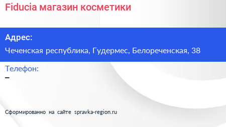 Fiducia, магазин косметики по адресу Чеченская республика, Гудермес, Белореченская, 38 в дальнейшем Организация, размещена в следующих категориях: