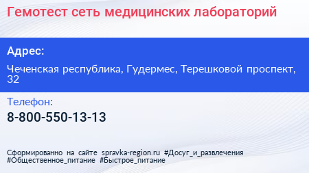 Гемотест, сеть медицинских лабораторий по адресу Чеченская республика, Гудермес, Терешковой проспект, 32 в дальнейшем Организация, размещена в следующих категориях: