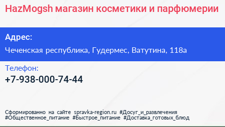 HazMogsh, магазин косметики и парфюмерии по адресу Чеченская республика, Гудермес, Ватутина, 118а в дальнейшем Организация, размещена в следующих категориях: