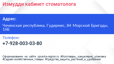 Измудди, кабинет стоматолога по адресу Чеченская республика, Гудермес, 84 Морской Бригады, 16Б в дальнейшем Организация, размещена в следующих категориях: