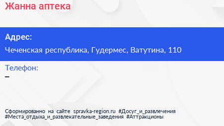Жанна, аптека по адресу Чеченская республика, Гудермес, Ватутина, 110 в дальнейшем Организация, размещена в следующих категориях: