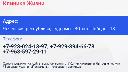 Клиника Жизни по адресу Чеченская республика, Гудермес, 40 лет Победы, 18 в дальнейшем Организация, размещена в следующих категориях: