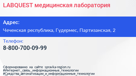 LABQUEST, медицинская лаборатория по адресу Чеченская республика, Гудермес, Партизанская, 2 в дальнейшем Организация, размещена в следующих категориях: