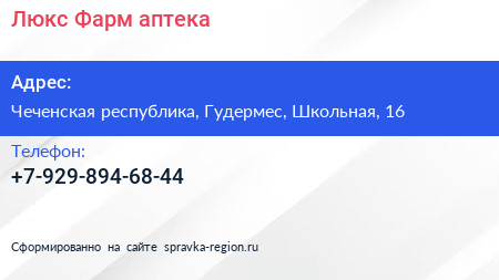 Люкс Фарм, аптека по адресу Чеченская республика, Гудермес, Школьная, 16 в дальнейшем Организация, размещена в следующих категориях: