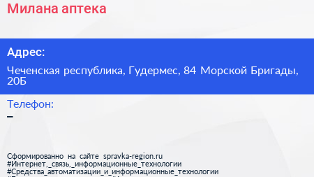 Милана, аптека по адресу Чеченская республика, Гудермес, 84 Морской Бригады, 20Б в дальнейшем Организация, размещена в следующих категориях: