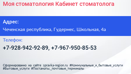 Моя стоматология, Кабинет стоматолога по адресу Чеченская республика, Гудермес, Школьная, 4а в дальнейшем Организация, размещена в следующих категориях: