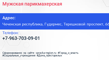 Мужская парикмахерская по адресу Чеченская республика, Гудермес, Терешковой проспект, 66 в дальнейшем Организация, размещена в следующих категориях: