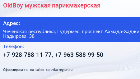 OldBoy, мужская парикмахерская по адресу Чеченская республика, Гудермес, проспект Ахмада-Хаджи Кадырова, 38 в дальнейшем Организация, размещена в следующих категориях:
