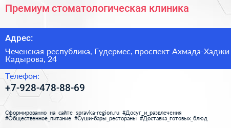 Премиум, стоматологическая клиника по адресу Чеченская республика, Гудермес, проспект Ахмада-Хаджи Кадырова, 24 в дальнейшем Организация, размещена в следующих категориях: