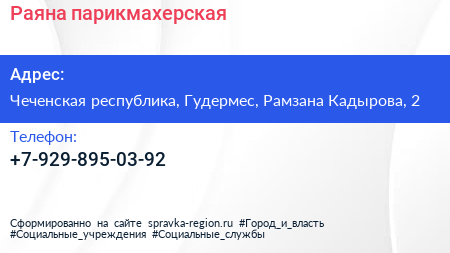 Раяна, парикмахерская по адресу Чеченская республика, Гудермес, Рамзана Кадырова, 2 в дальнейшем Организация, размещена в следующих категориях: