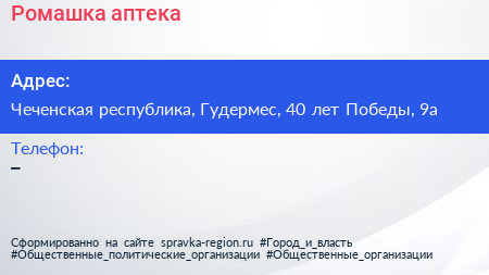 Ромашка, аптека по адресу Чеченская республика, Гудермес, 40 лет Победы, 9а в дальнейшем Организация, размещена в следующих категориях: