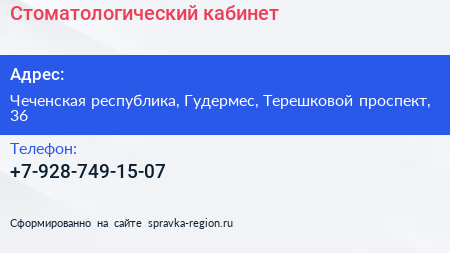 Стоматологический кабинет по адресу Чеченская республика, Гудермес, Терешковой проспект, 36 в дальнейшем Организация, размещена в следующих категориях: