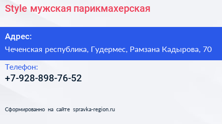 Style, мужская парикмахерская по адресу Чеченская республика, Гудермес, Рамзана Кадырова, 70 в дальнейшем Организация, размещена в следующих категориях:
