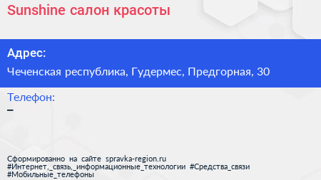 Sunshine, салон красоты по адресу Чеченская республика, Гудермес, Предгорная, 30 в дальнейшем Организация, размещена в следующих категориях: