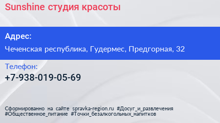 Sunshine, студия красоты по адресу Чеченская республика, Гудермес, Предгорная, 32 в дальнейшем Организация, размещена в следующих категориях: