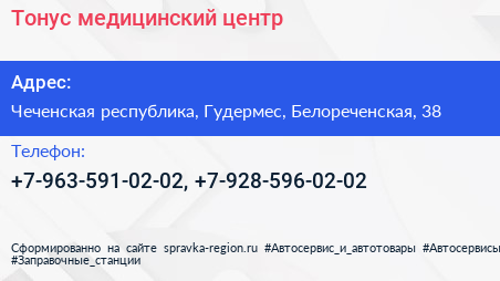 Тонус, медицинский центр по адресу Чеченская республика, Гудермес, Белореченская, 38 в дальнейшем Организация, размещена в следующих категориях: