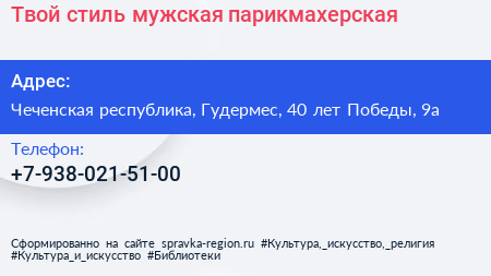 Твой стиль, мужская парикмахерская по адресу Чеченская республика, Гудермес, 40 лет Победы, 9а в дальнейшем Организация, размещена в следующих категориях: