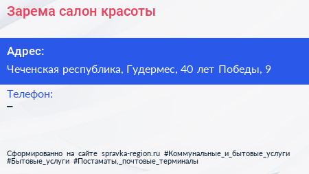 Зарема, салон красоты по адресу Чеченская республика, Гудермес, 40 лет Победы, 9 в дальнейшем Организация, размещена в следующих категориях: