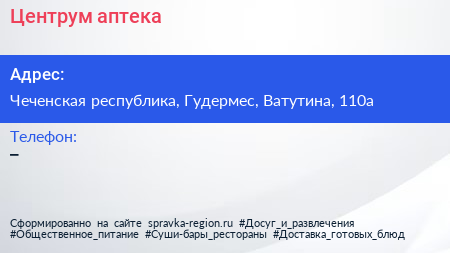 Центрум, аптека по адресу Чеченская республика, Гудермес, Ватутина, 110а в дальнейшем Организация, размещена в следующих категориях: