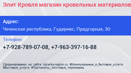 Элит-Кровля, магазин кровельных материалов по адресу Чеченская республика, Гудермес, Предгорная, 30 в дальнейшем Организация, размещена в следующих категориях: