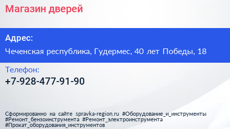 Магазин дверей по адресу Чеченская республика, Гудермес, 40 лет Победы, 18 в дальнейшем Организация, размещена в следующих категориях: