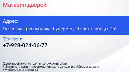 Магазин дверей по адресу Чеченская республика, Гудермес, 40 лет Победы, 19 в дальнейшем Организация, размещена в следующих категориях: