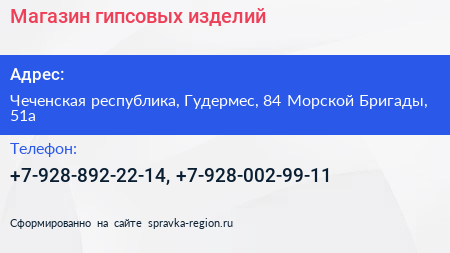 Магазин гипсовых изделий по адресу Чеченская республика, Гудермес, 84 Морской Бригады, 51а в дальнейшем Организация, размещена в следующих категориях: