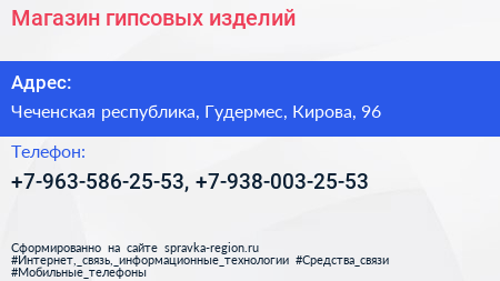 Магазин гипсовых изделий по адресу Чеченская республика, Гудермес, Кирова, 96 в дальнейшем Организация, размещена в следующих категориях: