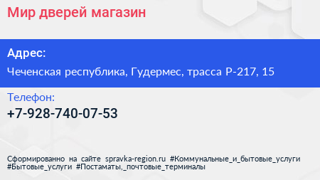 Мир дверей, магазин по адресу Чеченская республика, Гудермес, трасса Р-217, 15 в дальнейшем Организация, размещена в следующих категориях: