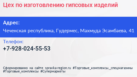 Цех по изготовлению гипсовых изделий по адресу Чеченская республика, Гудермес, Махмуда Эсамбаева, 41 в дальнейшем Организация, размещена в следующих категориях:
