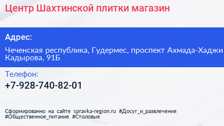 Центр Шахтинской плитки, магазин по адресу Чеченская республика, Гудермес, проспект Ахмада-Хаджи Кадырова, 91Б в дальнейшем Организация, размещена в следующих категориях:
