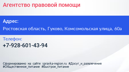 Агентство правовой помощи по адресу Ростовская область, Гуково, Комсомольская улица, 60а в дальнейшем Организация, размещена в следующих категориях: