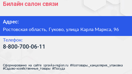 Билайн, салон связи по адресу Ростовская область, Гуково, улица Карла Маркса, 96 в дальнейшем Организация, размещена в следующих категориях: