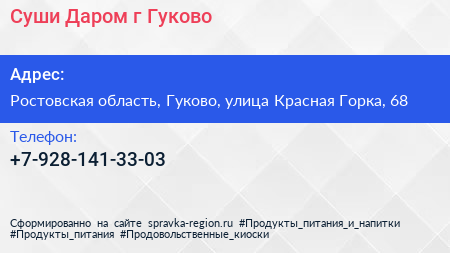Суши Даром, г. Гуково по адресу Ростовская область, Гуково, улица Красная Горка, 68 в дальнейшем Организация, размещена в следующих категориях: