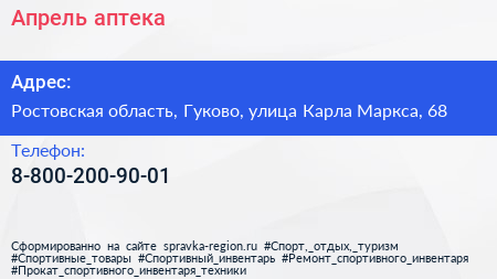 Апрель, аптека по адресу Ростовская область, Гуково, улица Карла Маркса, 68 в дальнейшем Организация, размещена в следующих категориях: